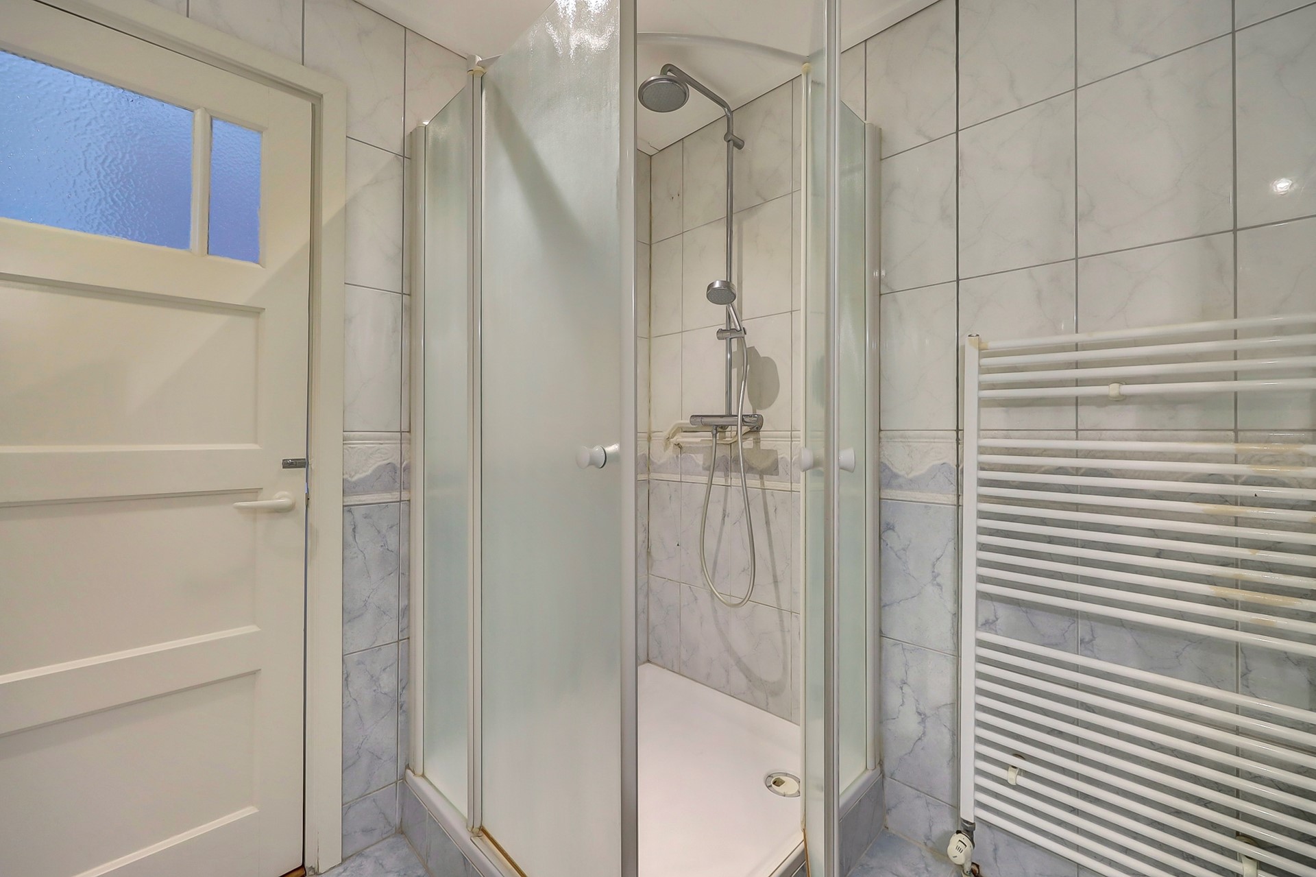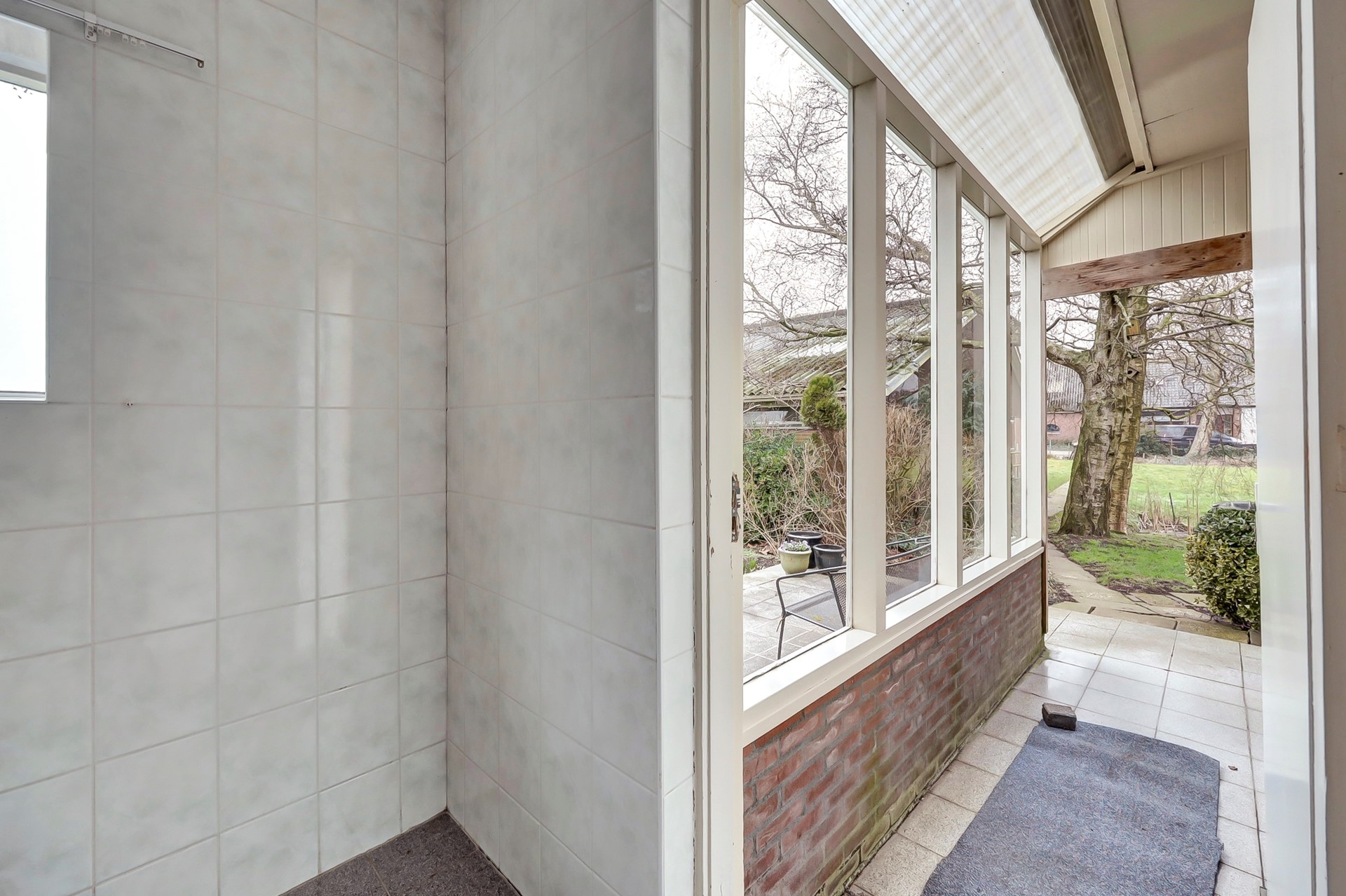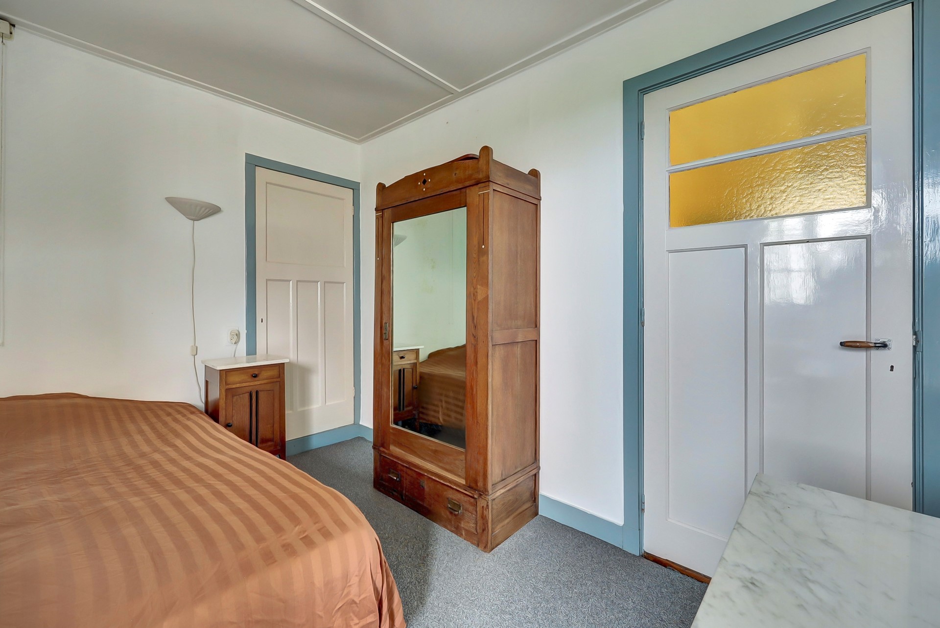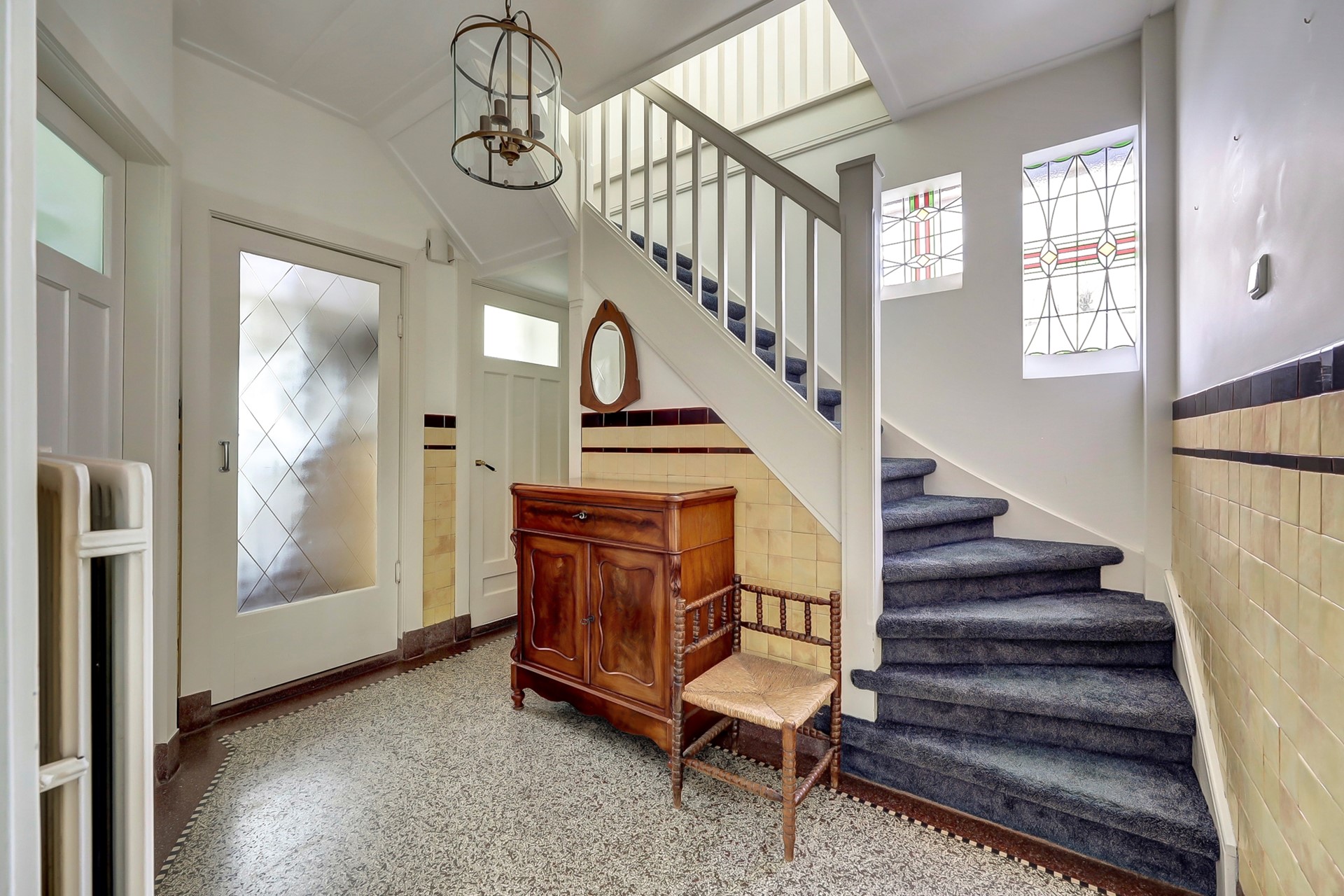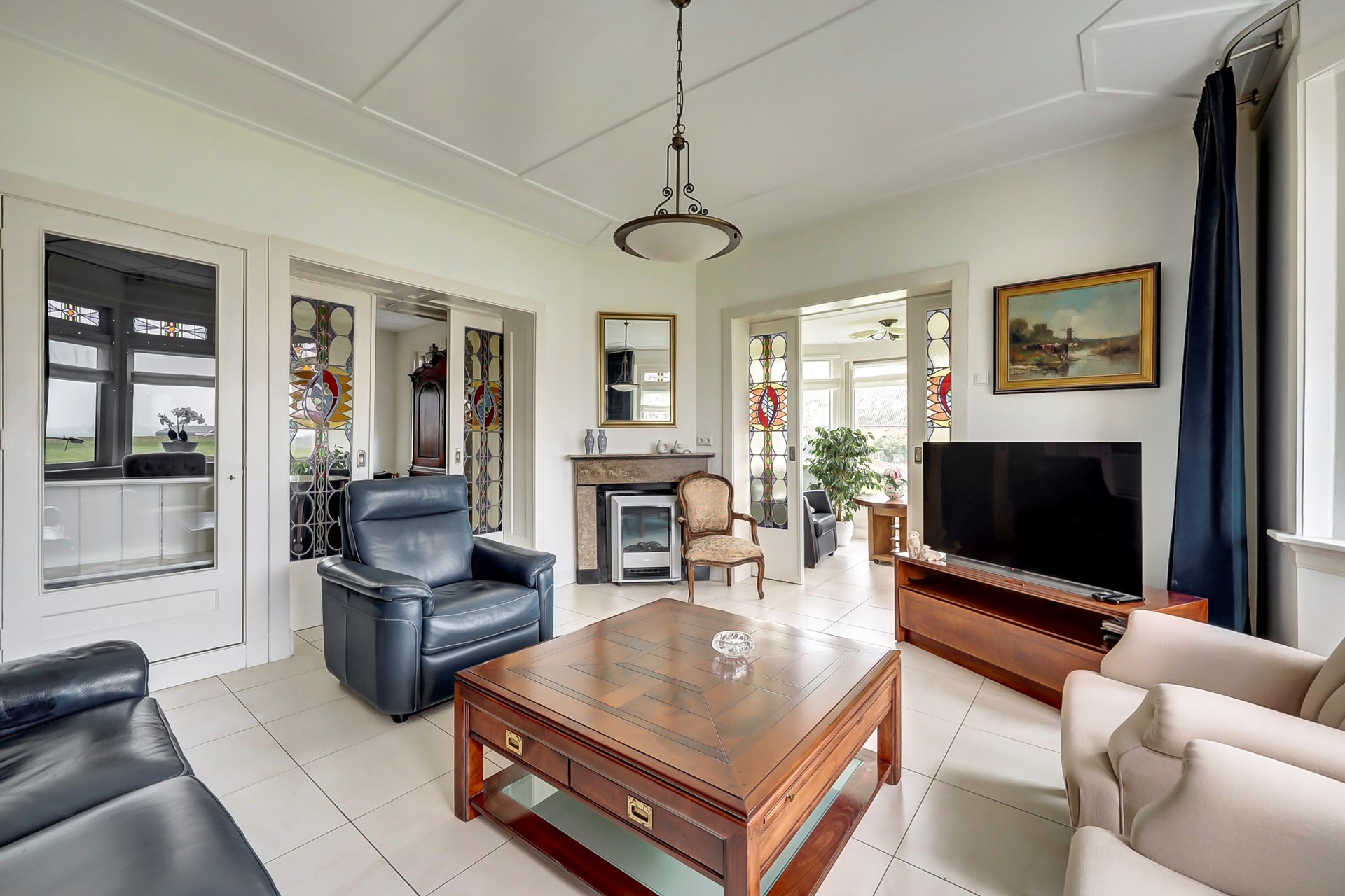 Binnen valt direct de lichte en vriendelijke sfeer op, versterkt door grote raampartijen en fraaie lichtinval. De woning beschikt over authentieke glas-in-loodramen en -schuifdeuren, die niet alleen een stijlvolle blikvanger zijn, maar ook bijdragen aan de unieke uitstraling en het historische karakter van het huis.
