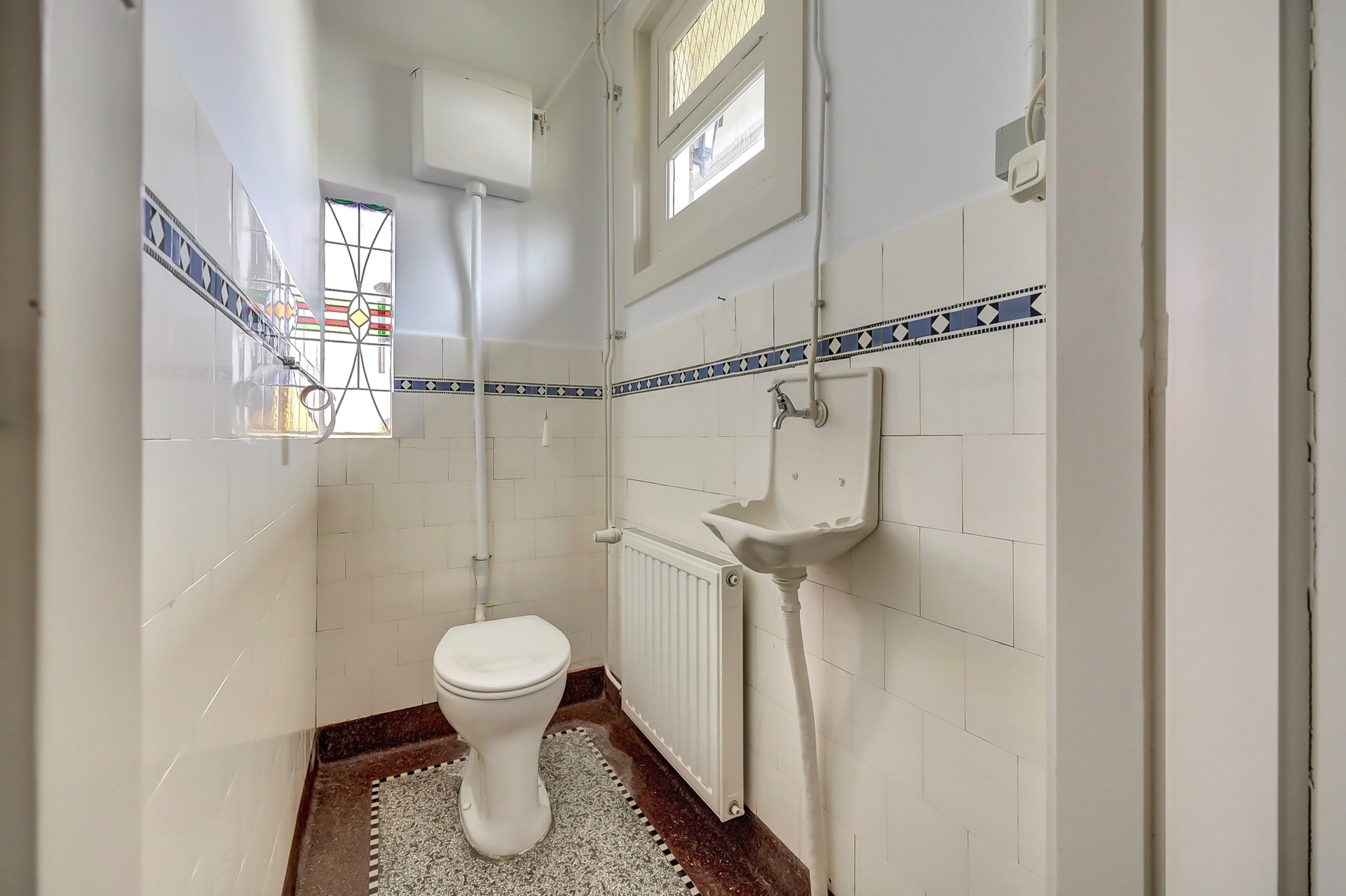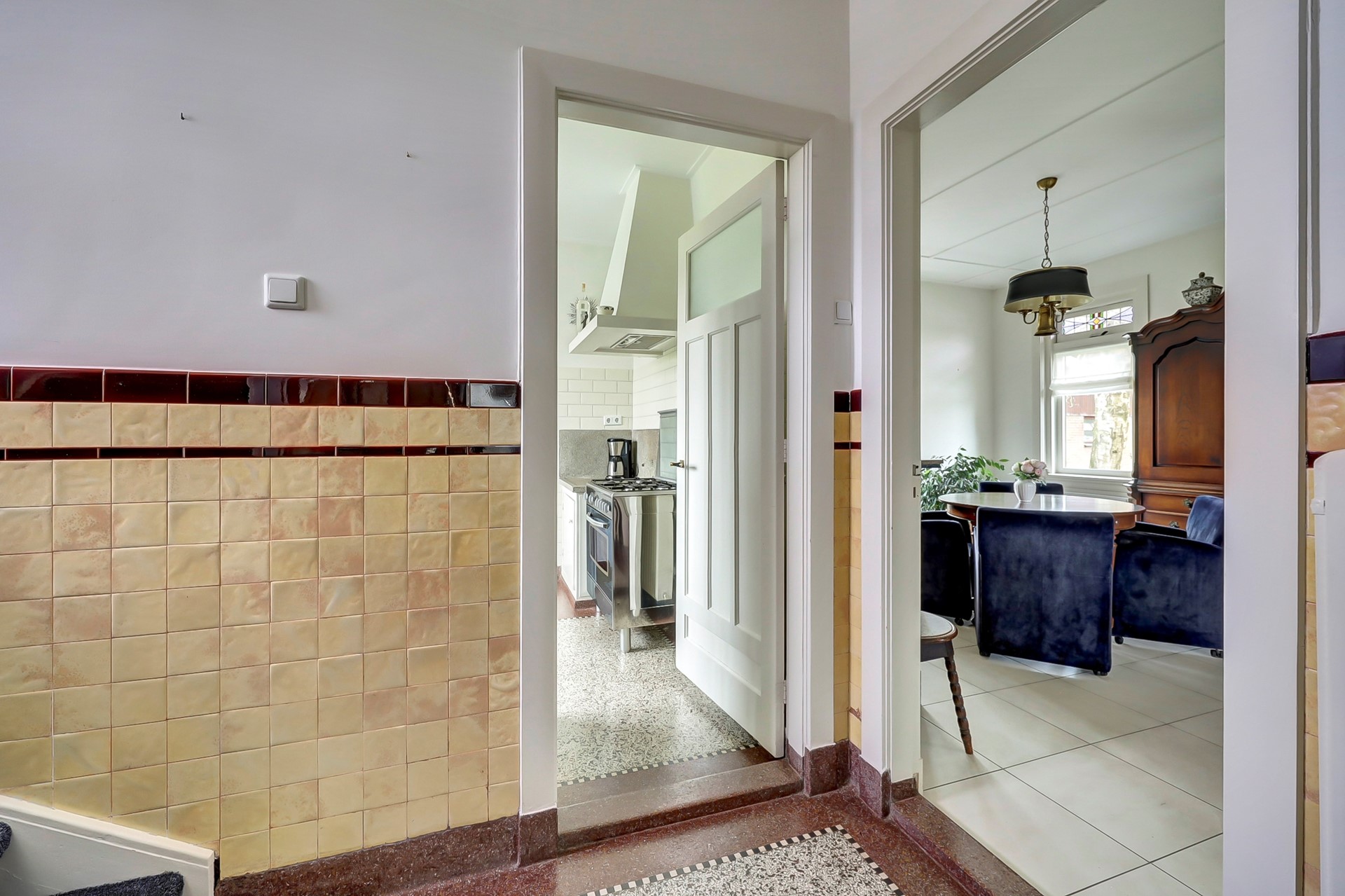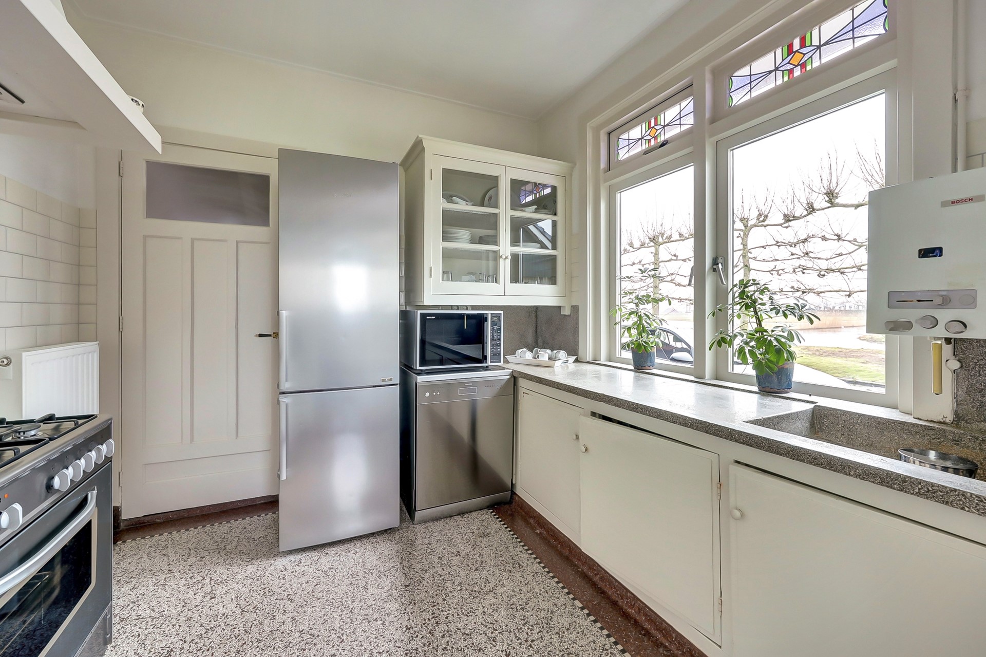 De keuken ademt eveneens karakter, met glas-in-lood bovenlichten en klassieke vloer. Het geheel straalt een nostalgische charme uit.