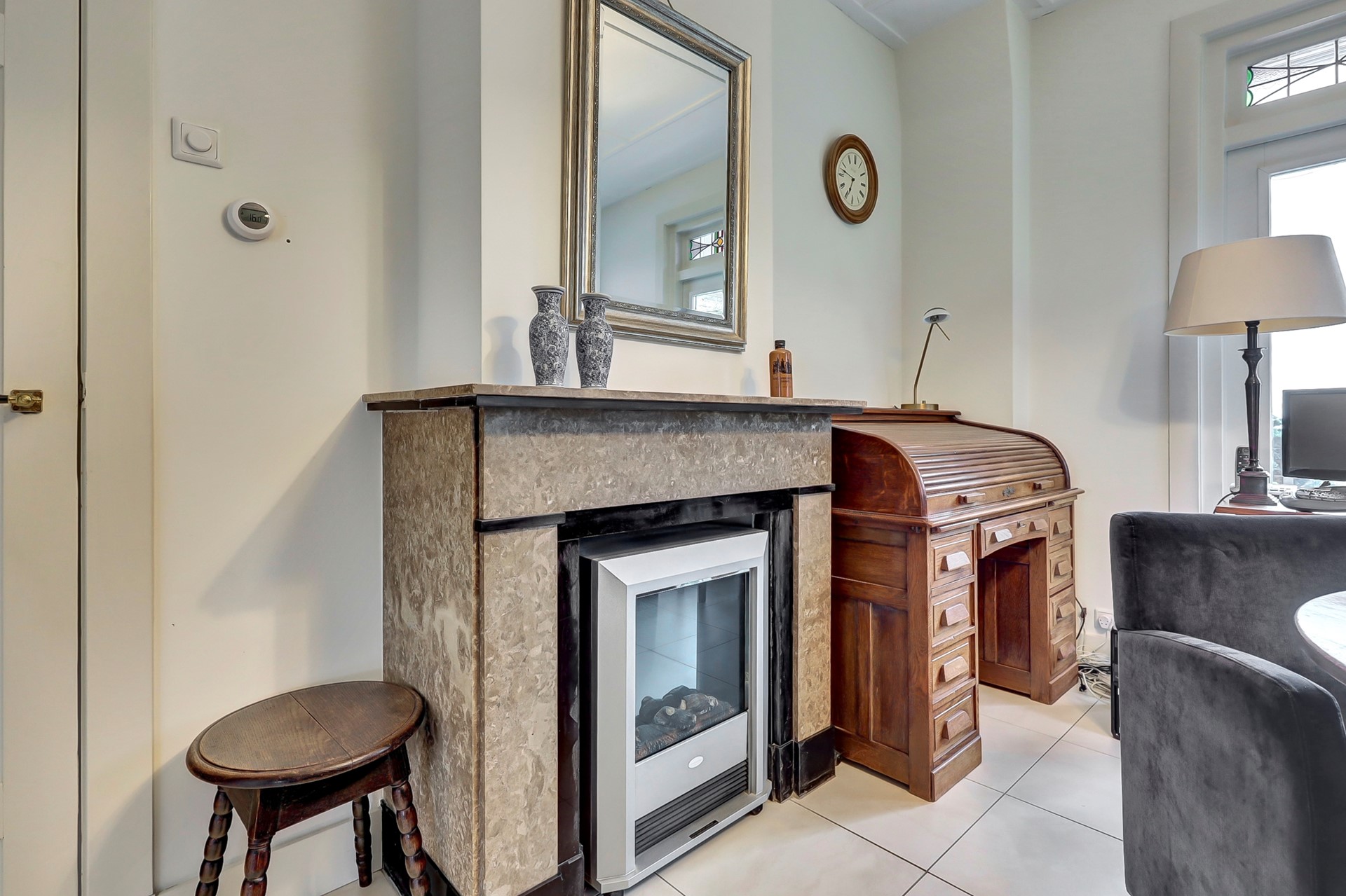 De combinatie van klassieke elementen, zoals paneeldeuren, schouw en sierlijke details, zorgt voor een warme en tijdloze ambiance.