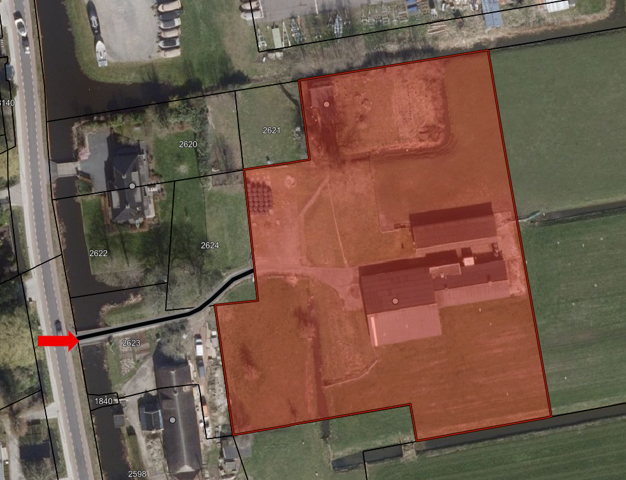 Agrarisch erf bestaande uit loods, schuur, open loods (ca 800 m²), verhard terrein en gras.